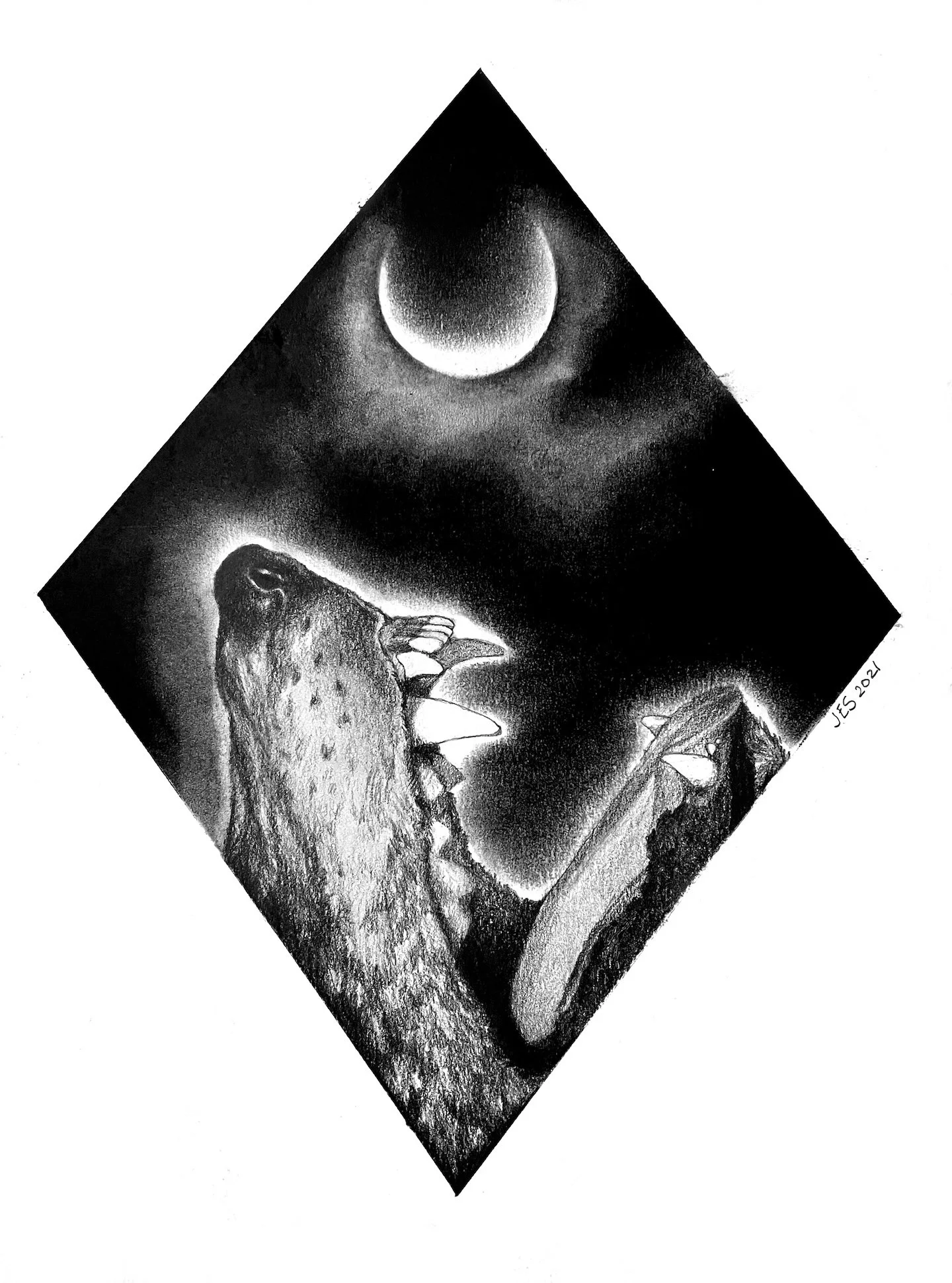 A black and white drawing of a wolf with large teeth, set against a dark sky with a crescent moon.