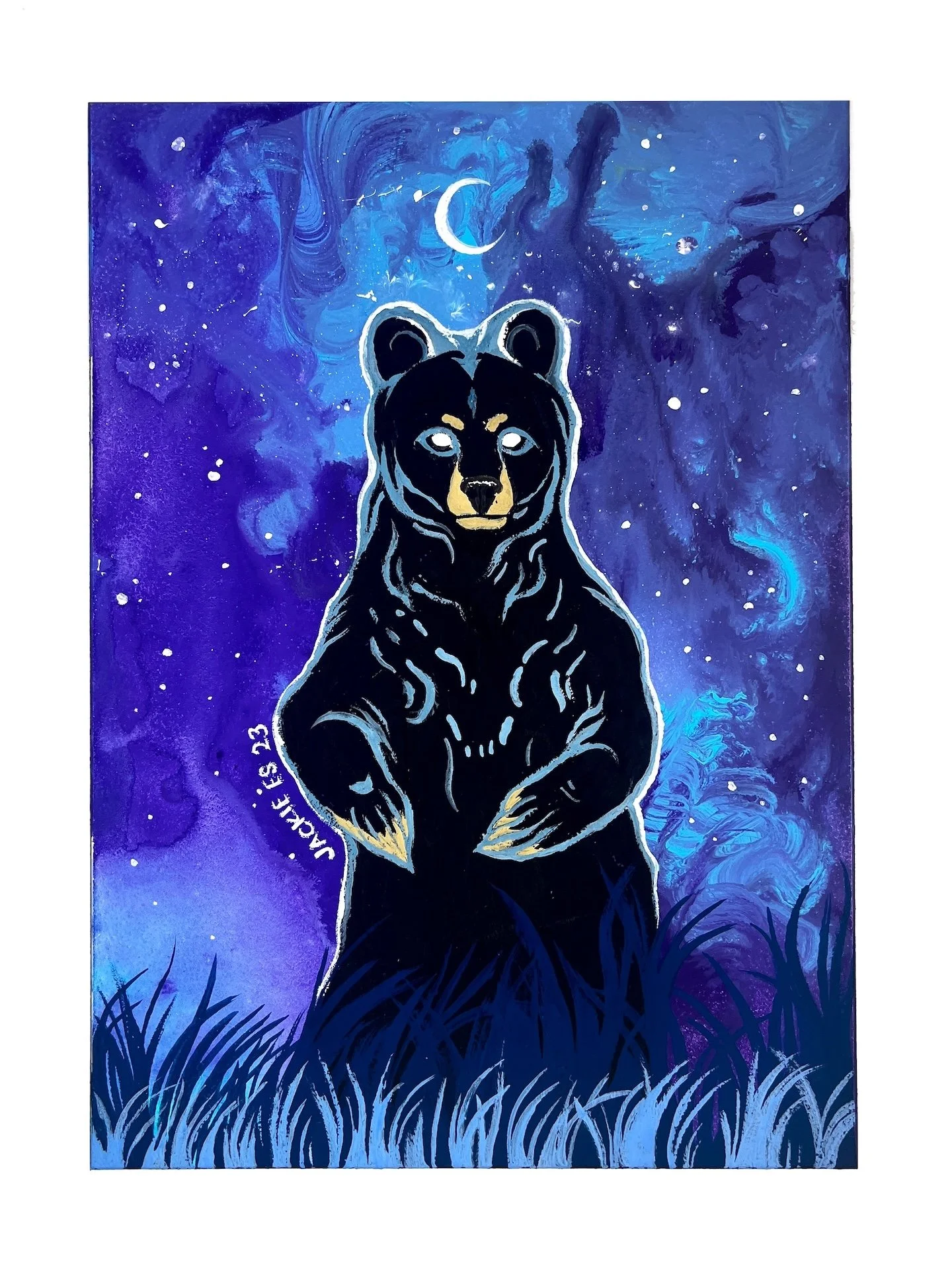 An artistic painting of a black bear standing on grass under a starry night sky with a crescent moon and swirling clouds
