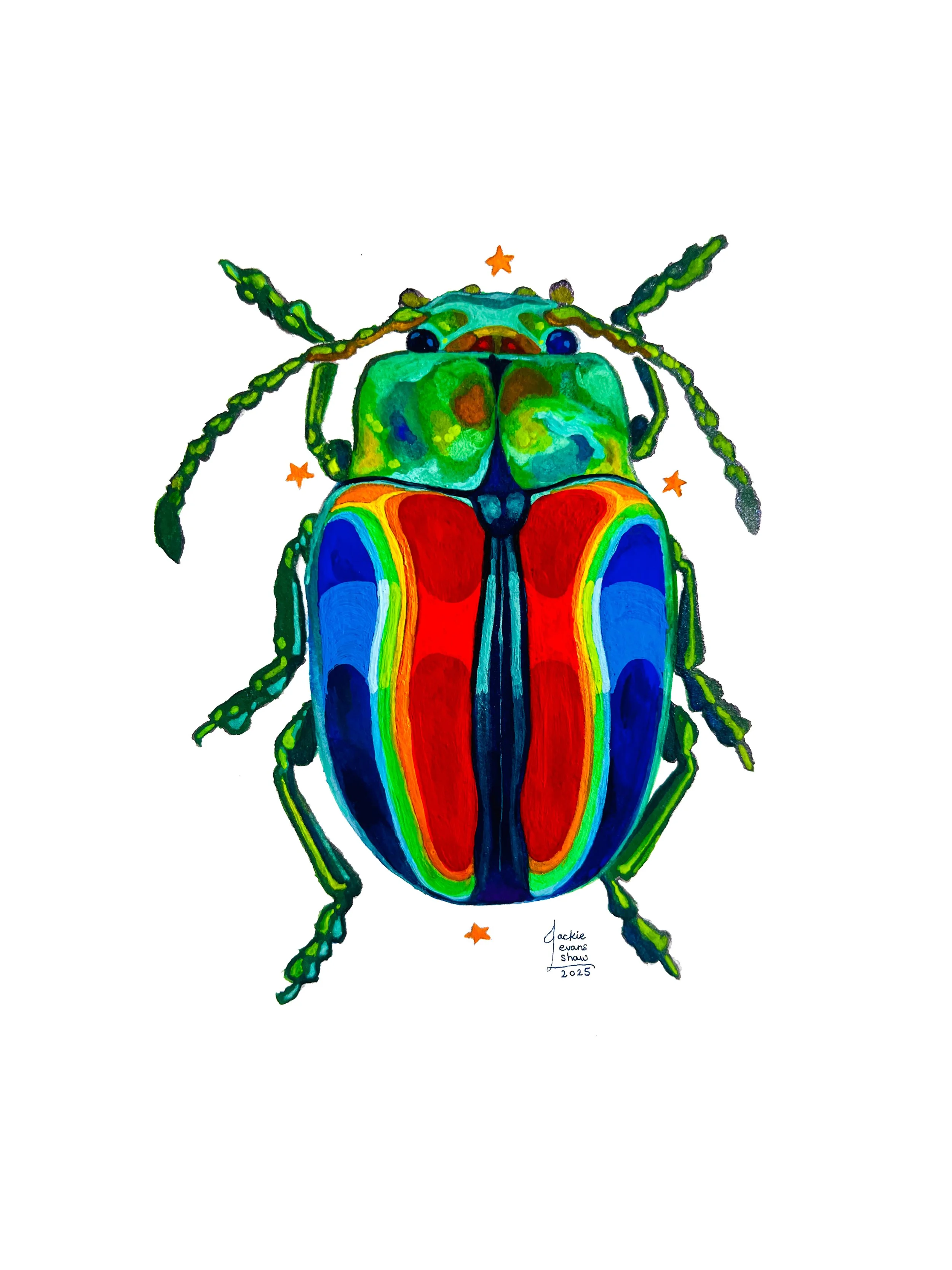 Colorful watercolor illustration of a beetle with a rainbow-colored shell, green head, and long antennae. Small orange stars are around the beetle.