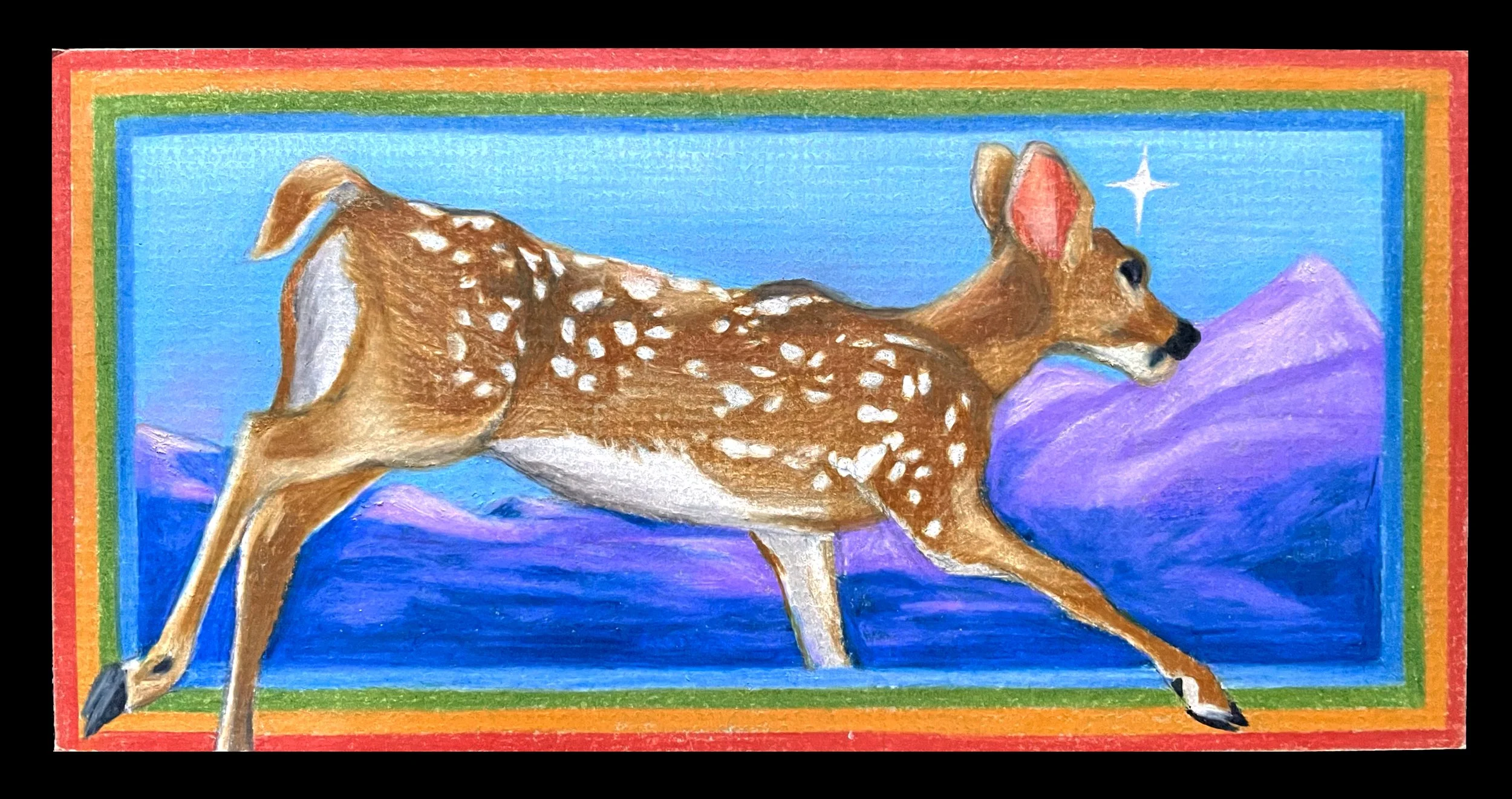 Colorful painting of a deer with white spots walking in a mountainous landscape with purple mountains, a blue sky, a shining star, and a rainbow border.
